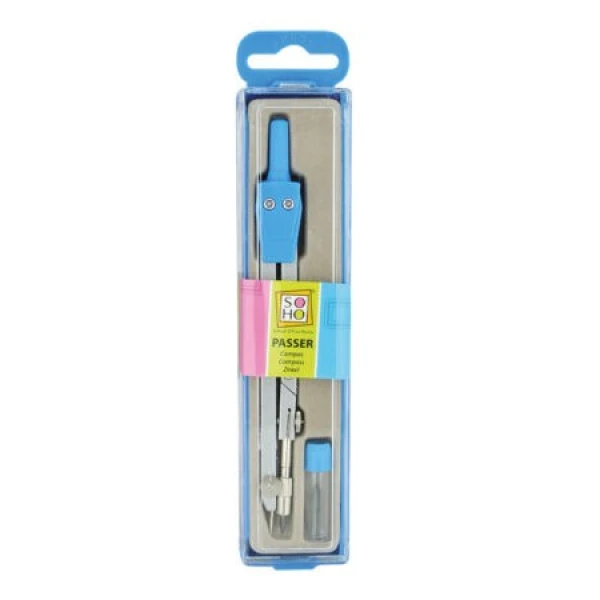 Basis passer van stevig metaal. In het bewaardoorsje zit: 1 metalen passer en 1 kokertje met potloodstiften in een doosje.