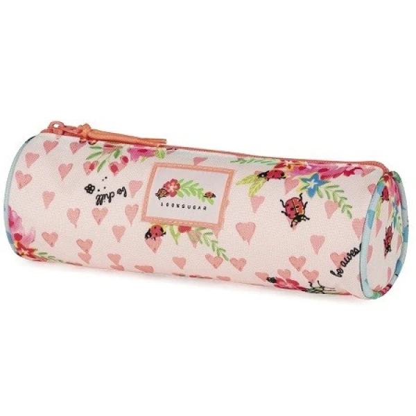 Superleuk 100% Sugar etui. Het etui heeft een vrolijk, lief en kleurrijk motief, verspreid over het gehele etui. Het etui heeft een standaard afmeting en een ronde vorm. Genoeg ruimte dus voor pennen, stiften, gum, etc.