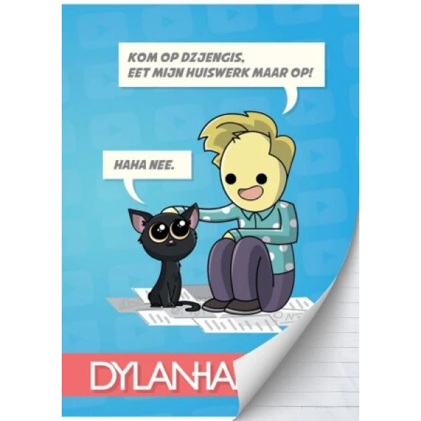 Dylan Haegens schrift in A4 formaat. Het schrift is gelinieerd en heeft een kantlijn. Het schrift heeft een grappige cartoon afbeelding van Dylan Haegens en Dzjengis. Natuurlijk hebben we ook de andere schoolspullen van Dylan Haegens in ons assortiment, deze zijn gemakkelijk mee te bestellen.