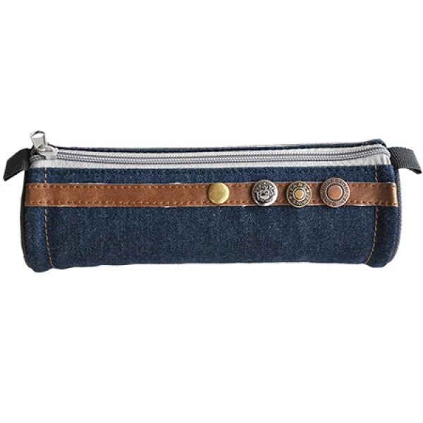 Mooi etui ( L 21cm x √∏ 7cm) vervaardigd uit spijkerstof en afgewerkt met 4 trendy kopen. Biedt voldoende ruimte voor het opbergen van alle benodigde schrijf spulletjes.