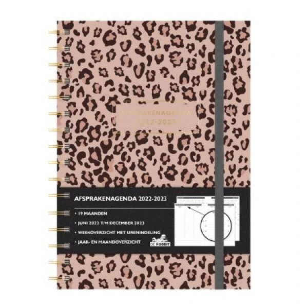 Met deze afsprakenagenda mis je geen afspraak meer. Deze ringband agenda met harde cover in A5-formaat is voorzien van een poederroze met zwart panterprint ontwerp, met de tekst gedrukt in goudfolie. De indeling van de afsprakenagenda is één week over twee pagina’s in verticale kolommen, in deze kolommen is de tijd ingedeeld in uren. Ook bevat deze afsprakenagenda jaar- en maandoverzichten. De agenda wordt dichtgehouden door een elastieken band en heeft een verplaatsbare bladwijzer om snel bij de juiste afspraak te zijn. Deze agenda is een 19 maanden exemplaar en loopt van juni 2022 tot en met december 2023.