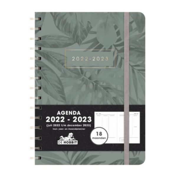 Deze stijlvolle 18 maanden hardcover ringband agenda is niet te missen door de cover heeft een print van groene palmbladeren tegen een grijsgroene achtergrond. Deze topper is zeer uitgebreid met diverse jaarplanners en maandplanners. De indeling van de agenda is één week over twee pagina’s in verticale kolommen. Onderin vind je een handig kalendertje van de desbetreffende maand. De agenda wordt gesloten door een donkergrijze elastieken band. De agenda heeft een verplaatsbare bladwijzer. Deze ruime overzichtelijke agenda loopt van juli 2022 tot en met december 2023.