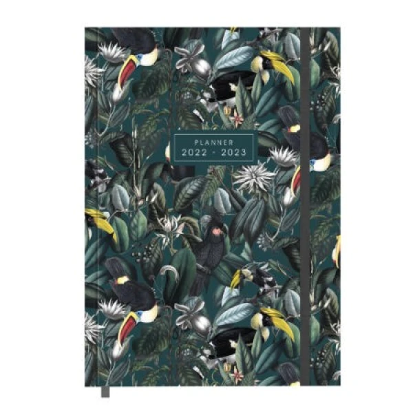 Deze chique agenda/planner met harde cover is bedrukt met een prachtige print van toekans, papegaaien en tropische planten en dit op een donkere achtergrond. De agenda wordt gesloten door een zwarte elastieken band. Het leeslint helpt je snel de juiste pagina te vinden. De indeling van de agenda is één week over twee pagina’s in verticale kolommen. Als extra heeft deze agenda jaarplanners voor 2022 en 2023. Deze ruime overzichtelijke agenda loopt van eind mei 2022 tot begin augustus 2023.