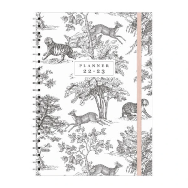 Stijlvolle agenda met zwarte ringband. Deze agenda heeft een harde cover en is bedrukt met een vintage zwart/wit print van tijgers, panters, herten en bomen op een lichte achtergrond. De agenda wordt gesloten door een zalmroze elastieken band. De verplaatsbare bladwijzer helpt je snel de juiste pagina te vinden. De indeling van de agenda is één week over twee pagina’s in verticale kolommen. Als extra heeft deze agenda jaarplanners voor 2022 en 2023. Deze ruime overzichtelijke agenda loopt van eind mei 2022 tot begin augustus 2023.