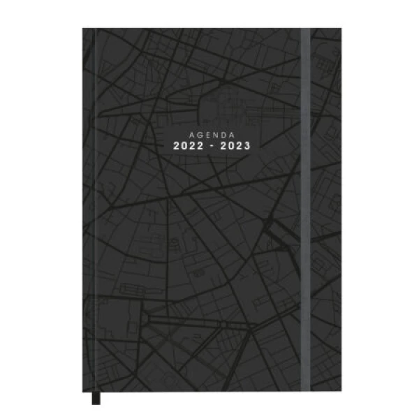 Stijlvolle agenda met een harde cover, de cover is donkergrijs met een landkaart in glanzende zwarte lijnen, de tekst is in zilverfolie. De agenda wordt gesloten door een grijze elastieken band. Het leeslint helpt je snel de juiste pagina te vinden. De indeling van de agenda is รฉรฉn week over twee paginaโs. Als extra heeft deze agenda jaarplanners voor 2022 en 2023. Deze ruime overzichtelijke agenda loopt van eind mei 2022 tot begin augustus 2023.