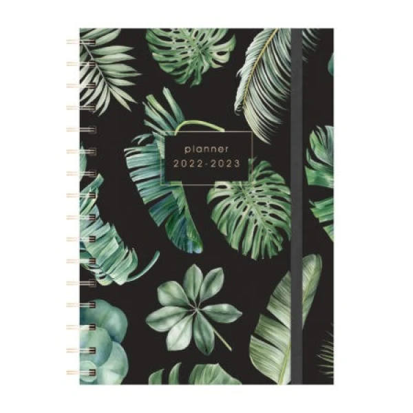Prachtige agenda met goudkleurig ringband. De cover heeft mooie botanische bladeren met een chique zwarte achtergrond. De tekst is gedrukt goudfolie. De agenda wordt gesloten door een donkergrijze elastieken band. De verplaatsbare bladwijzer helpt je snel de juiste pagina te vinden. De indeling van de agenda is één week over twee pagina’s in verticale kolommen. Als extra heeft deze agenda jaarplanners voor 2022 en 2023. Deze ruime overzichtelijke agenda loopt van eind mei 2022 tot begin augustus 2023.