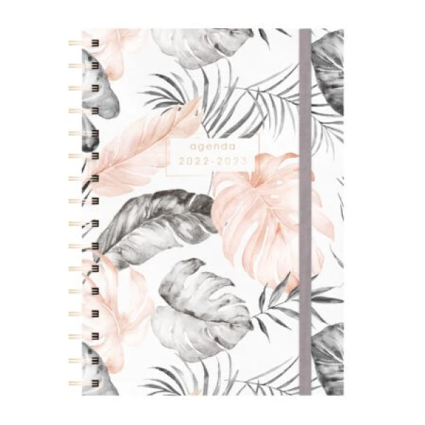 Deze trendy agenda met goudkleurige ringband heeft een cover met een botanische print van zachtroze en grijze bladeren op een lichte achtergrond. De tekst is gedrukt goudfolie. De agenda wordt gesloten door een donkergrijze elastieken band. De verplaatsbare bladwijzer helpt je snel de juiste pagina te vinden. De indeling van de agenda is รฉรฉn week over twee paginaโs. Als extra heeft deze agenda jaarplanners voor 2022 en 2023. Deze ruime overzichtelijke agenda loopt van eind mei 2022 tot begin augustus 2023.