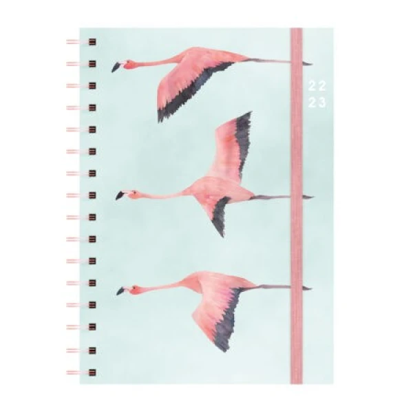 Prachtige agenda met felroze ringband. De cover heeft drie flamingo’s op een mint kleurige achtergrond. De agenda wordt gesloten door een felroze elastieken band. De verplaatsbare bladwijzer helpt je snel de juiste pagina te vinden. De indeling van de agenda is één week over twee pagina’s. Als extra heeft deze agenda jaarplanners voor 2022 en 2023. Deze ruime overzichtelijke agenda loopt van eind mei 2022 tot begin augustus 2023.