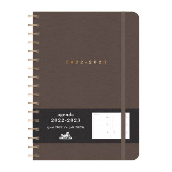 Deze agenda met harde cover is al jaren één van onze toppers. Met een goudkleurig spiraal. De cover is donkerbruin suède achtig met een goudfolie opdruk. De agenda is ruim en rustig van opzet en wordt gesloten door een lichtblauwe elastieken band. De verplaatsbare bladwijzer helpt je snel de juiste pagina te vinden. Dit ruime overzichtelijke exemplaar loopt van eind mei 2022 tot begin augustus 2023.