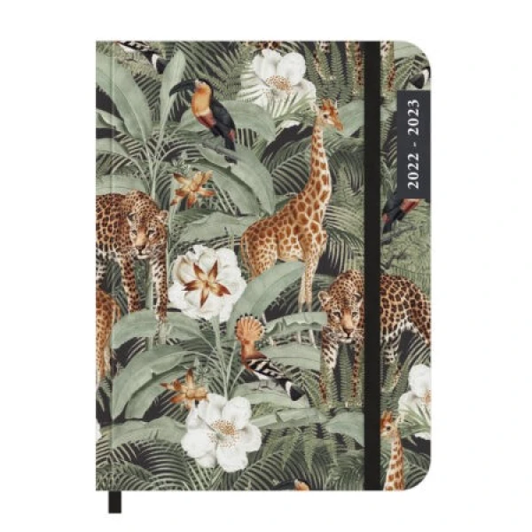 Stoere agenda in A6-formaat met zachte cover en afgeronde hoeken. De cover is vormgegeven met een vrolijke jungle print met giraffen, panters en tropische bladeren, tegen een zwarte achtergrond. De agenda wordt gesloten door een zwart elastieken band. Ook mag het leeslint niet ontbreken. De indeling van de agenda is รฉรฉn week over twee paginaโs. Deze agenda loopt van eind mei 2022 tot begin augustus 2023. Dit kleine juweel mag in je tas gezien worden!