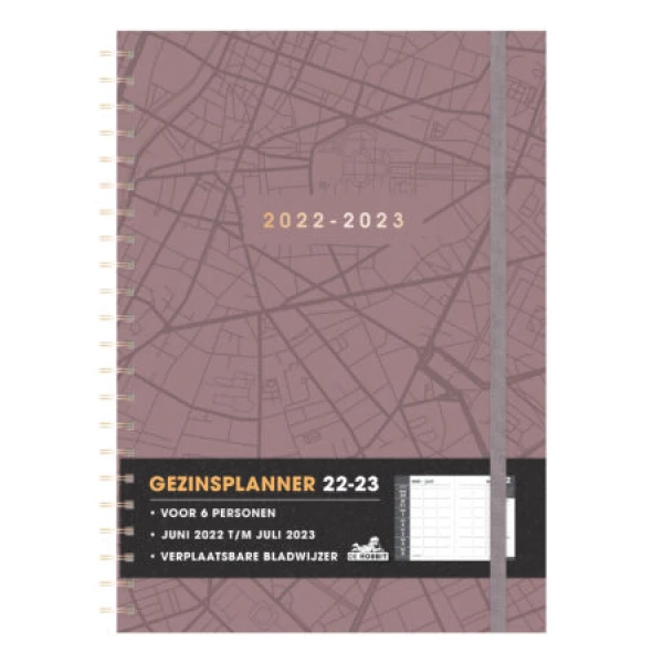Mooie moderne gezinsplanner om al jullie afspraken in één oogopslag te plannen. Deze gezinsplanner heeft een harde cover met een goudkleurig spiraal. de cover is bordeaux achtig rood met een landkaart in glanzende donkere lijnen. De tekst in goudkleurige folie maakt hem helemaal af. De planner is voor 6 personen, één week is verdeeld over 2 pagina’s. De namen kun je in de bovenste horizontale vakken neerzetten. De gezinsplanner wordt gesloten door een grijze elastieken band. De verplaatsbare bladwijzer helpt je snel de juiste pagina te vinden. Dit ruime overzichtelijke exemplaar loopt van eind mei 2022 tot begin augustus 2023.
