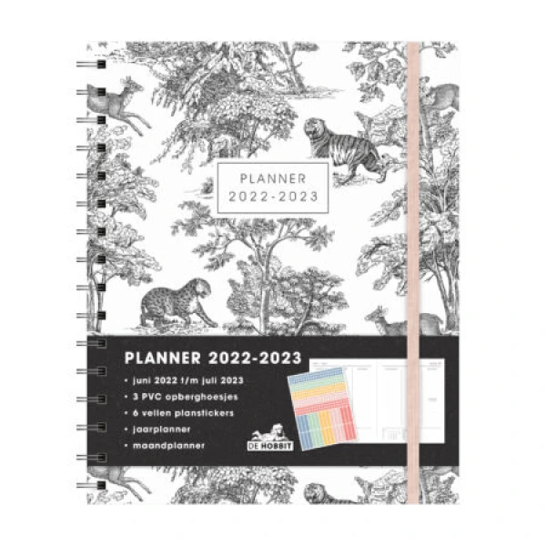 Deze stoere, opvallende planner met ringband heeft een harde cover en is bedrukt met een vintage zwart/wit print van tijgers, panters, herten en bomen op een lichte achtergrond. Deze planner is zeer compleet en bevat jaarplanners en maandplanners. Ook heeft deze planner 6 handige vellen planstickers en 3 transparante opberghoezen. De planner wordt dichtgehouden door een lichtroze elastieken band en heeft een verplaatsbare bladwijzer. De indeling van de planner is één week over twee pagina’s in verticale kolommen. Deze planner loopt van juni 2022 tot en met juli 2023.