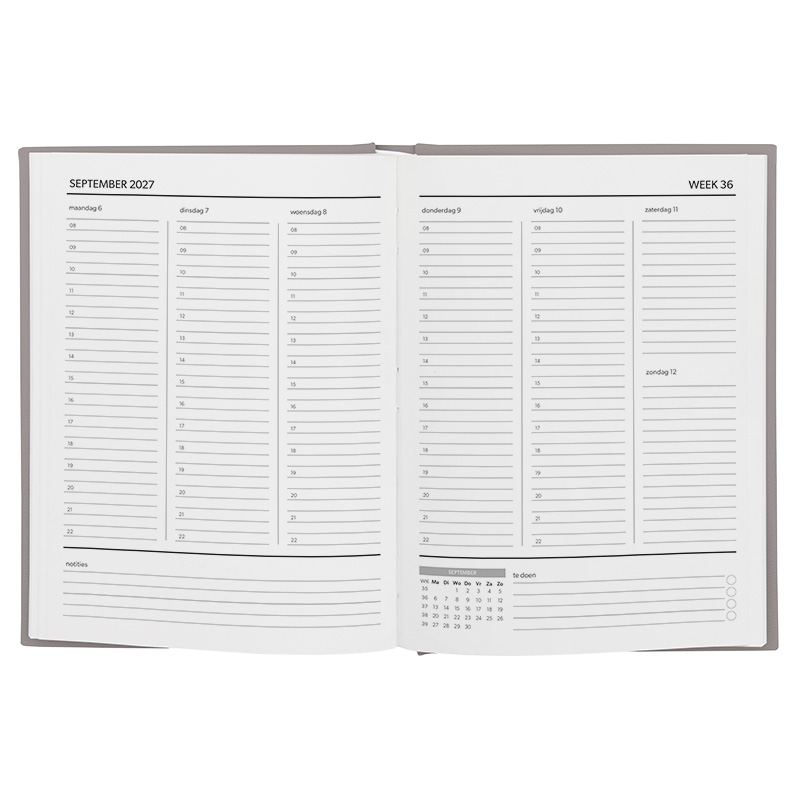 Organiseer je afspraken in stijl met deze SOHO Street Planner in een elegante lichtgrijze kleur. Met een royaal formaat van 29 x 21 cm biedt deze planner een helder overzicht van รฉรฉn week over twee pagina’s, perfect voor uitgebreide planningen en notities. De planner heeft een looptijd van 18 maanden en is afgewerkt met een robuuste harde kaft, waardoor hij uitermate geschikt is voor dagelijks gebruik op kantoor, school of thuis.